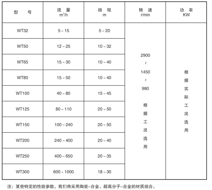 WT型耐酸陶瓷砂浆泵是单级离心泵,泵体和泵盖采用耐腐、耐磨性优良的耐酸陶瓷制造,外用铸铁铠装以资保护。叶轮材质主要为工程塑料,如用户需要,也可配制工程陶瓷。轴封结构采用背叶片减压结合氟橡胶油封圈或付叶轮离心式密封。