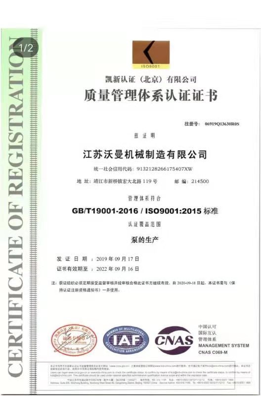 泵的生产通过ISO9001认证